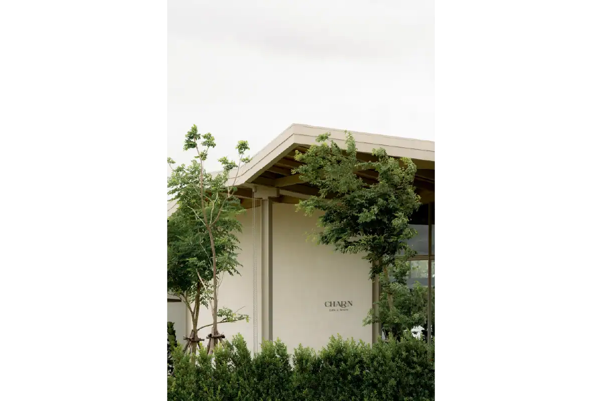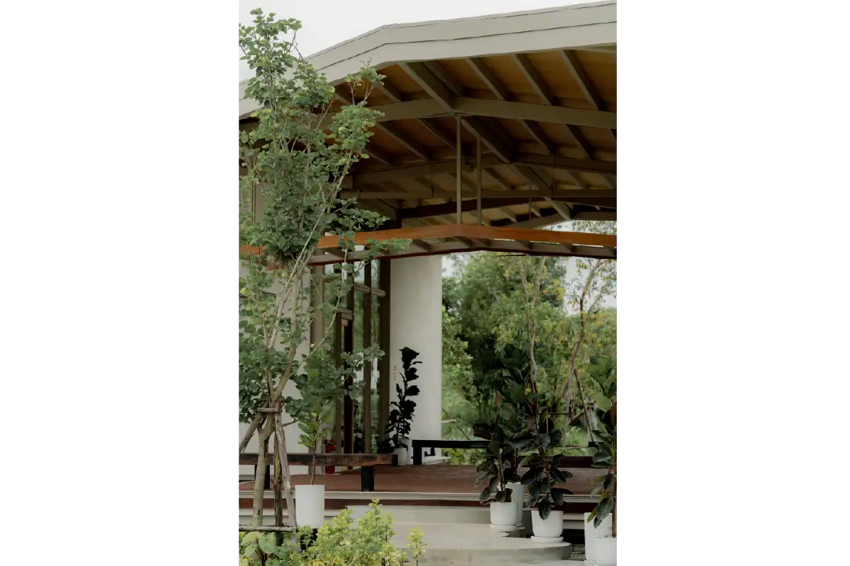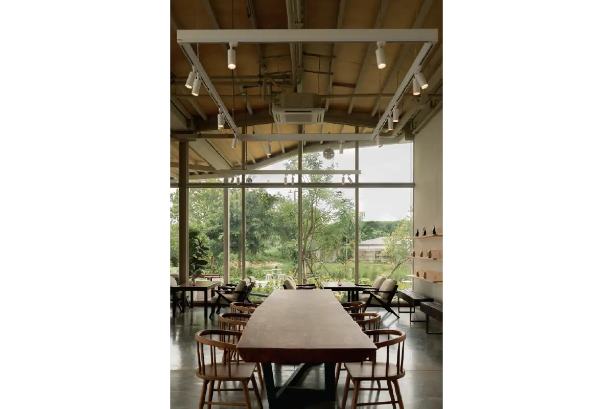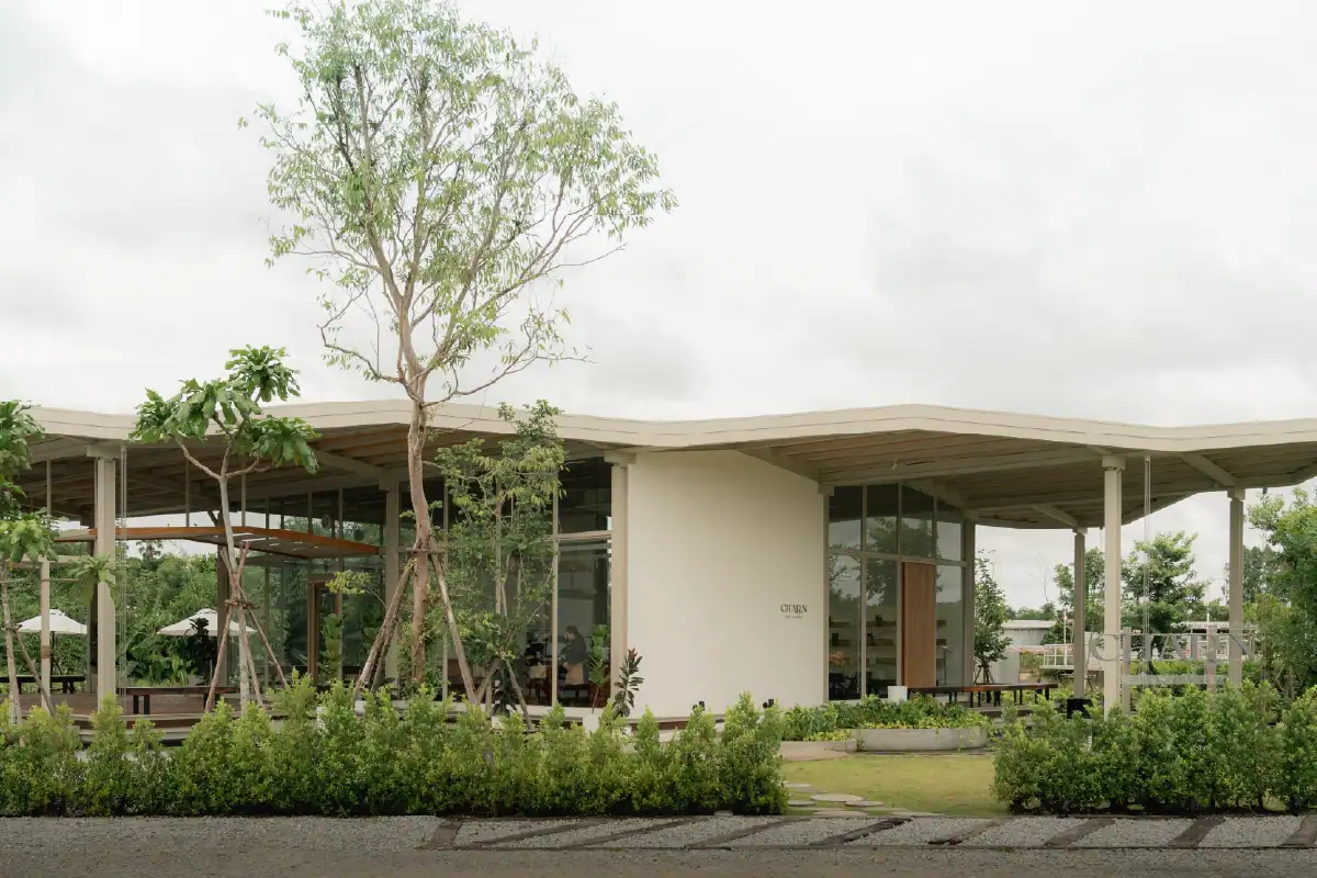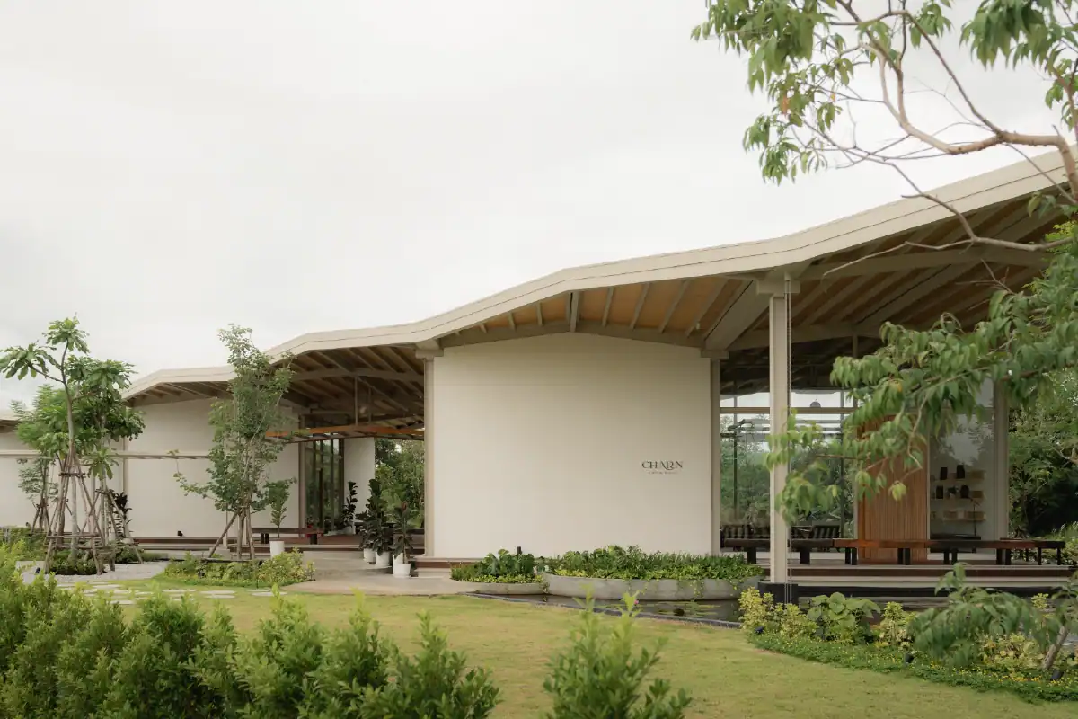 Charn Cafe is a restaurant and bistro located in Rayong’s industrial district. Designed from the ground up, the project was envisioned as a calm and inviting oasis amidst a setting defined by heavy industry and structure. To create a sense of contrast and retreat, the building is broken into separate blocks — each serving a different function — and arranged diagonally to embrace views of the surrounding water and lush landscape. This layout allows the architecture to flow naturally into its environment, softening the site’s industrial edge. Natural materials like wood, brick, and concrete were chosen to express warmth and authenticity, while also subtly reflecting the owner’s background as a contractor through a gentle nod to brutalist design.