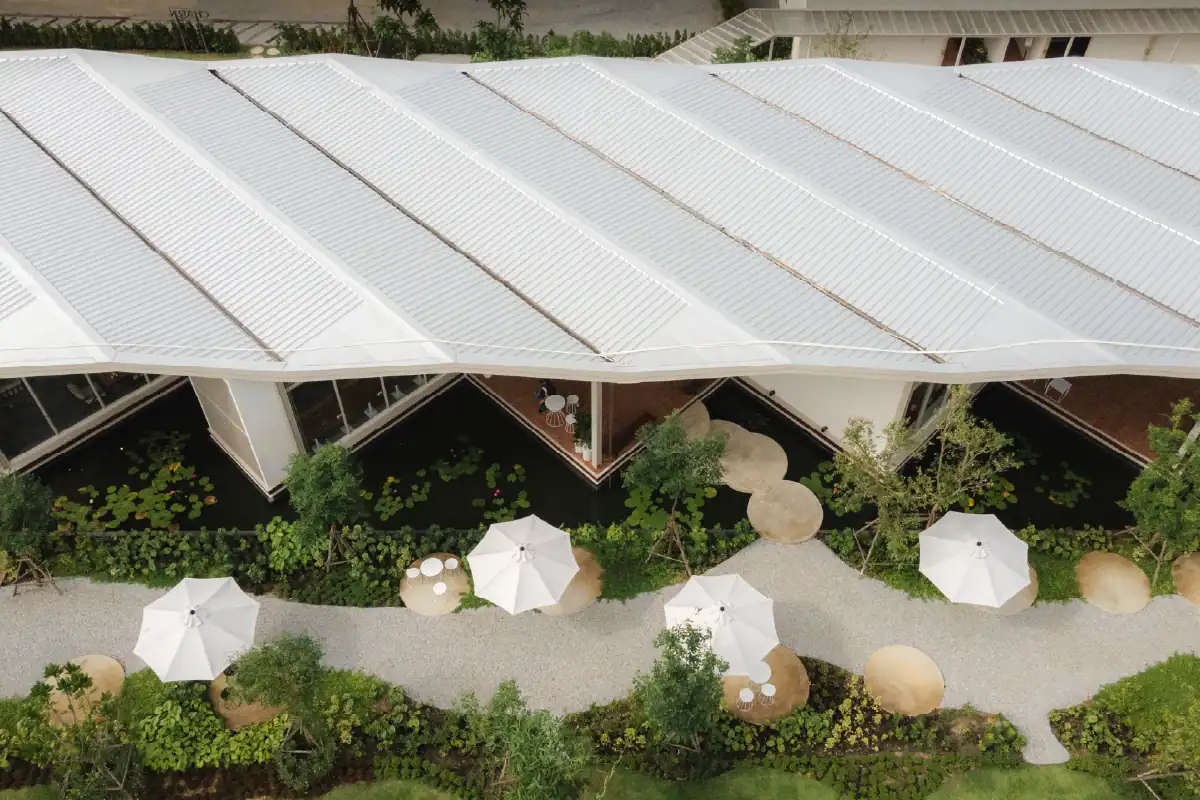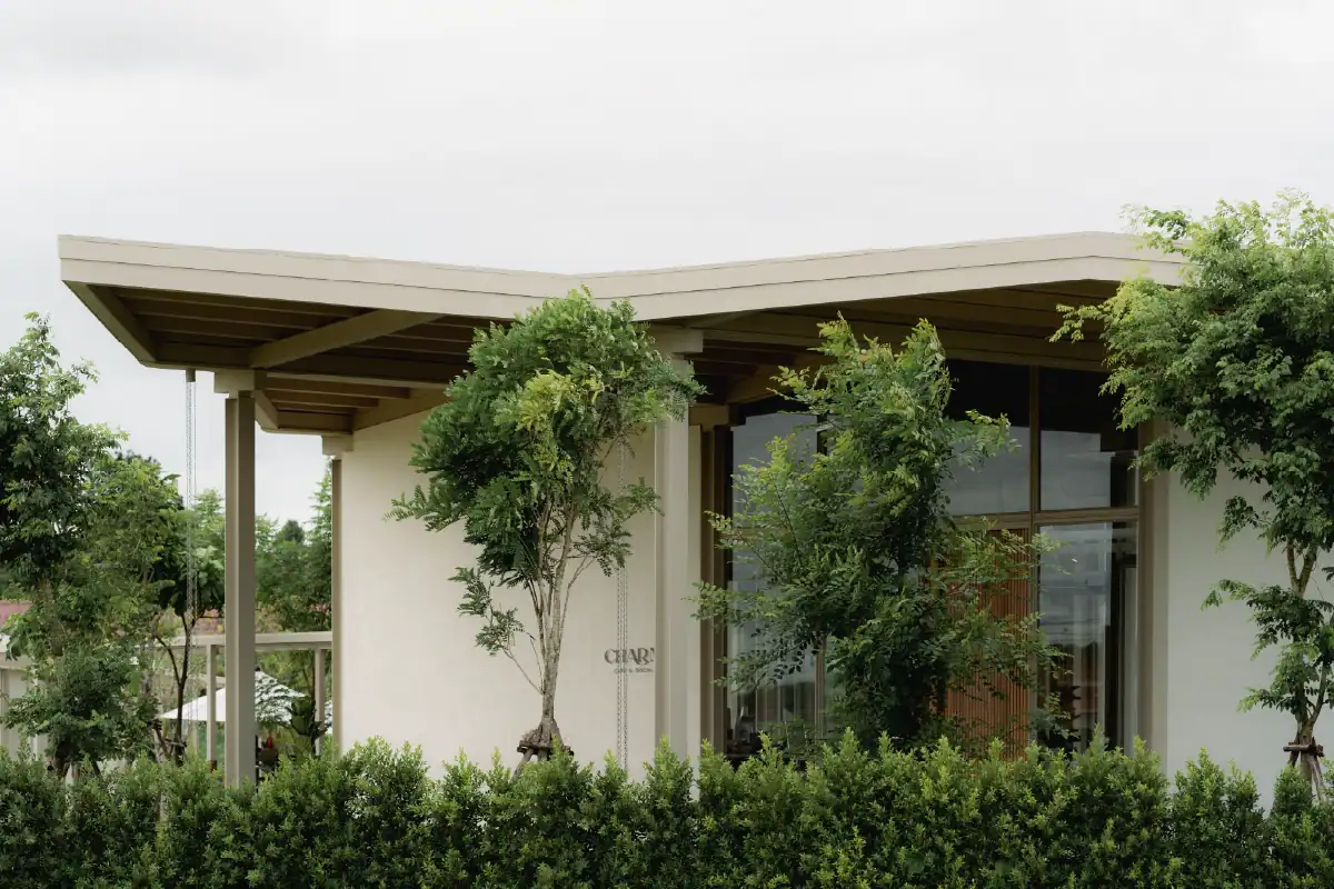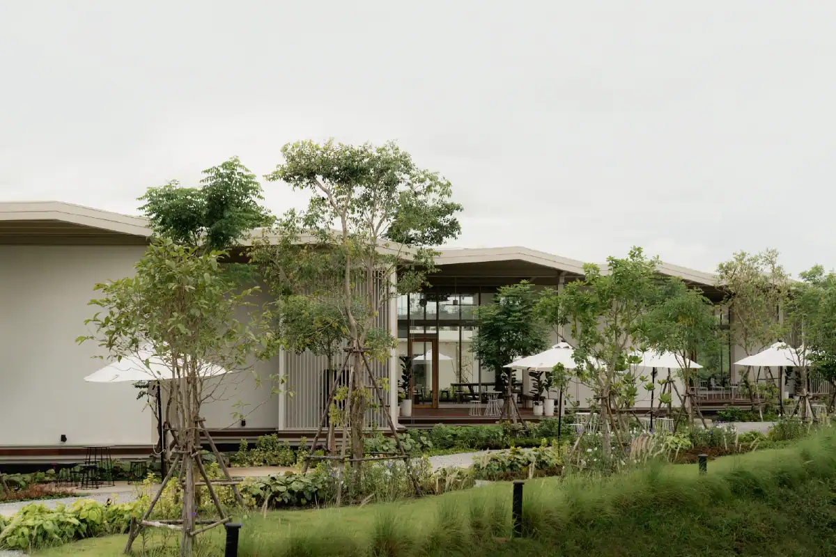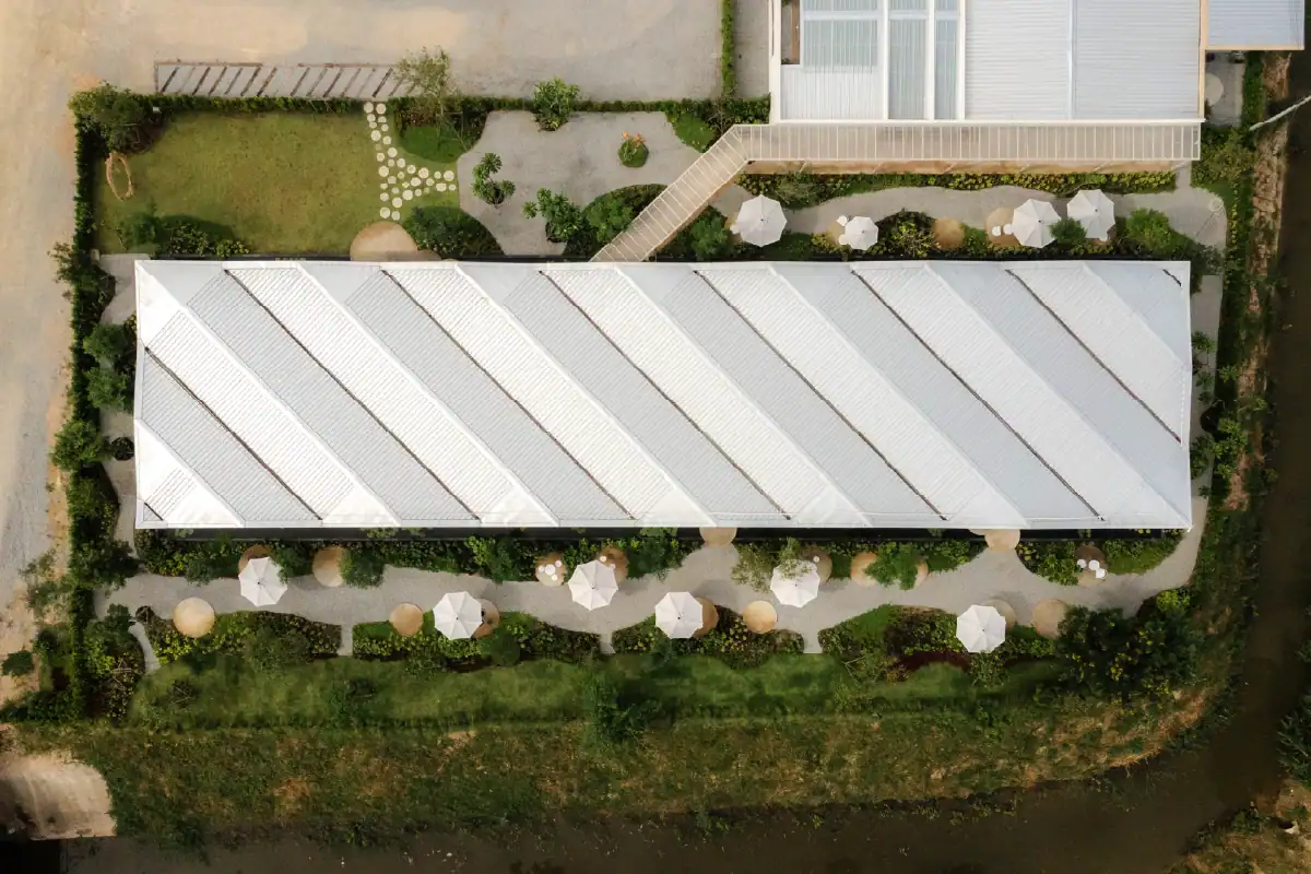 Charn Cafe is a restaurant and bistro located in Rayong’s industrial district. Designed from the ground up, the project was envisioned as a calm and inviting oasis amidst a setting defined by heavy industry and structure. To create a sense of contrast and retreat, the building is broken into separate blocks — each serving a different function — and arranged diagonally to embrace views of the surrounding water and lush landscape. This layout allows the architecture to flow naturally into its environment, softening the site’s industrial edge. Natural materials like wood, brick, and concrete were chosen to express warmth and authenticity, while also subtly reflecting the owner’s background as a contractor through a gentle nod to brutalist design.
