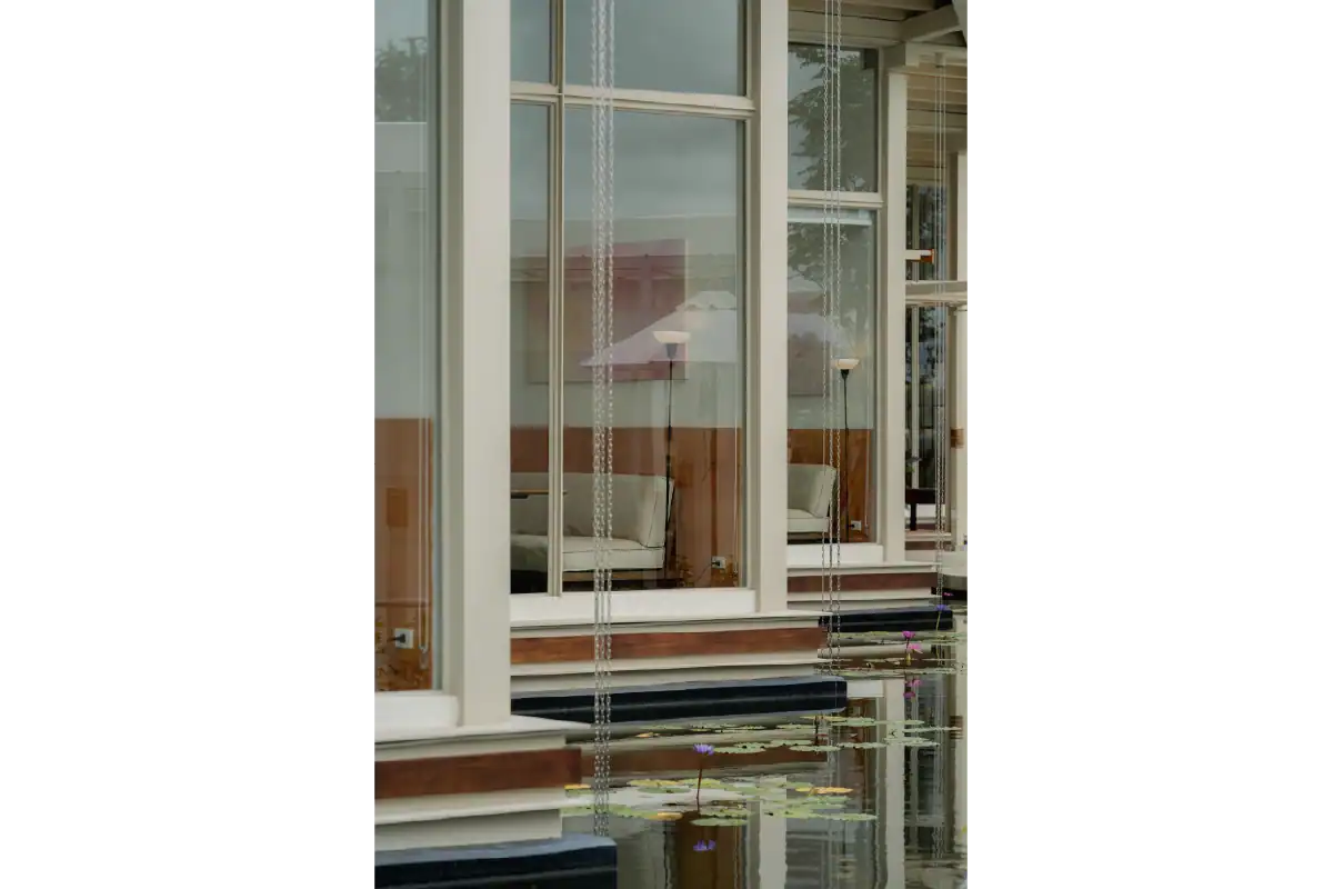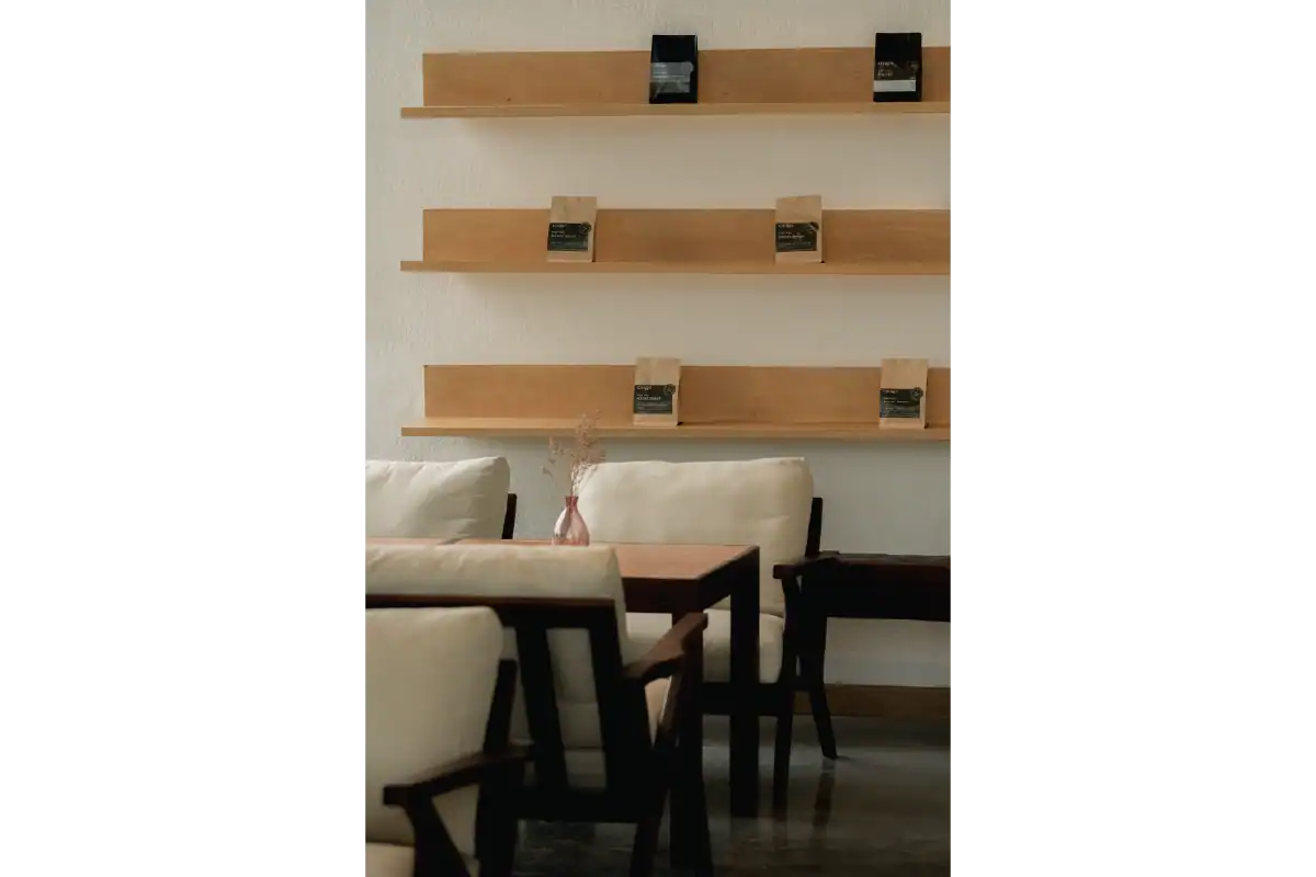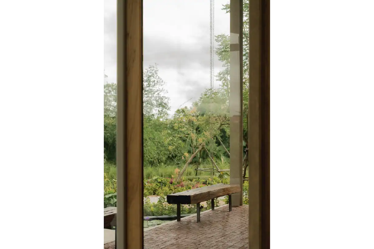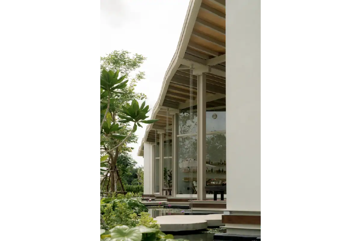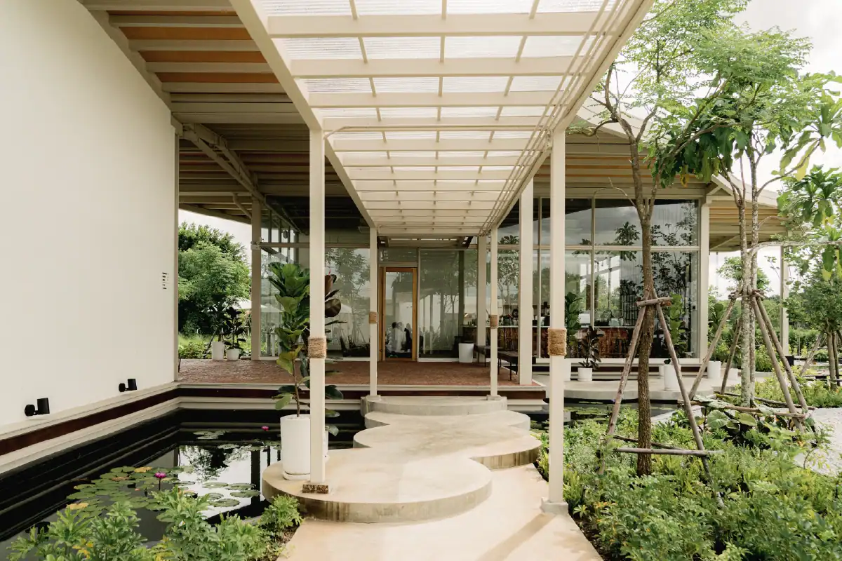 Charn Cafe is a restaurant and bistro located in Rayong’s industrial district. Designed from the ground up, the project was envisioned as a calm and inviting oasis amidst a setting defined by heavy industry and structure. To create a sense of contrast and retreat, the building is broken into separate blocks — each serving a different function — and arranged diagonally to embrace views of the surrounding water and lush landscape. This layout allows the architecture to flow naturally into its environment, softening the site’s industrial edge. Natural materials like wood, brick, and concrete were chosen to express warmth and authenticity, while also subtly reflecting the owner’s background as a contractor through a gentle nod to brutalist design.