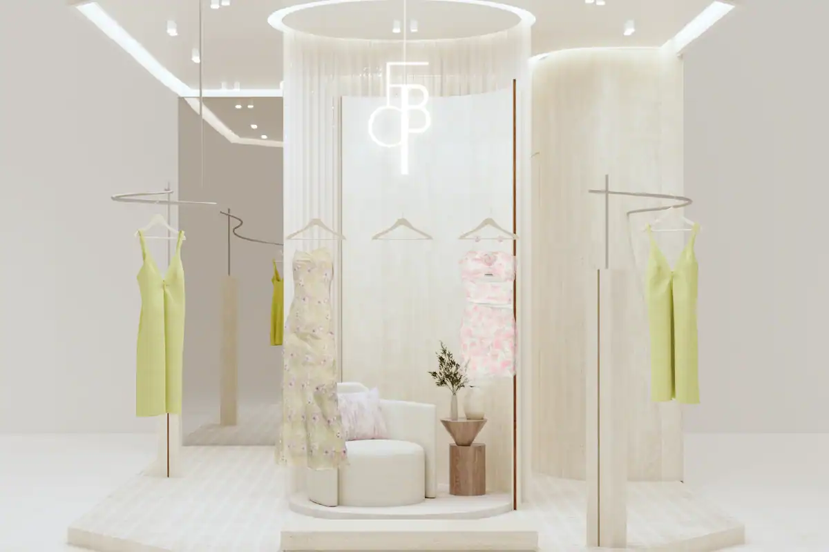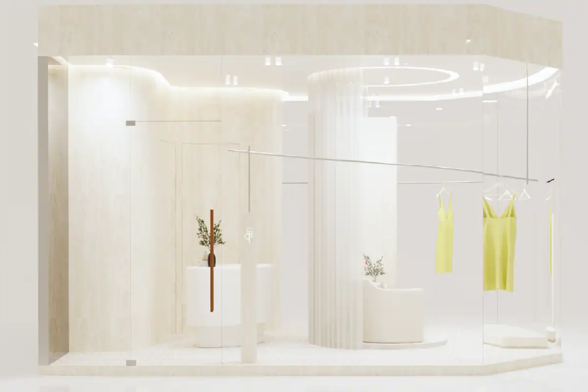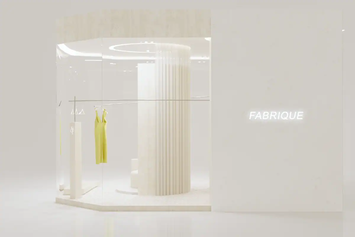 Fabrique Store is a clothing boutique located in a new shopping mall in Bangkok. Positioned in the center of the mall, the store opens on three sides to maximize window displays, allowing the clothing to be showcased from multiple angles. The fitting room is centrally placed, serving both as a functional space and as a backdrop for photos. Enclosed with curtains, it can be opened or closed to create a variety of scenes within this compact space. Neutral materials—such as beige tiles, travertine stone, and textured white walls—set a serene atmosphere, letting the products truly stand out.